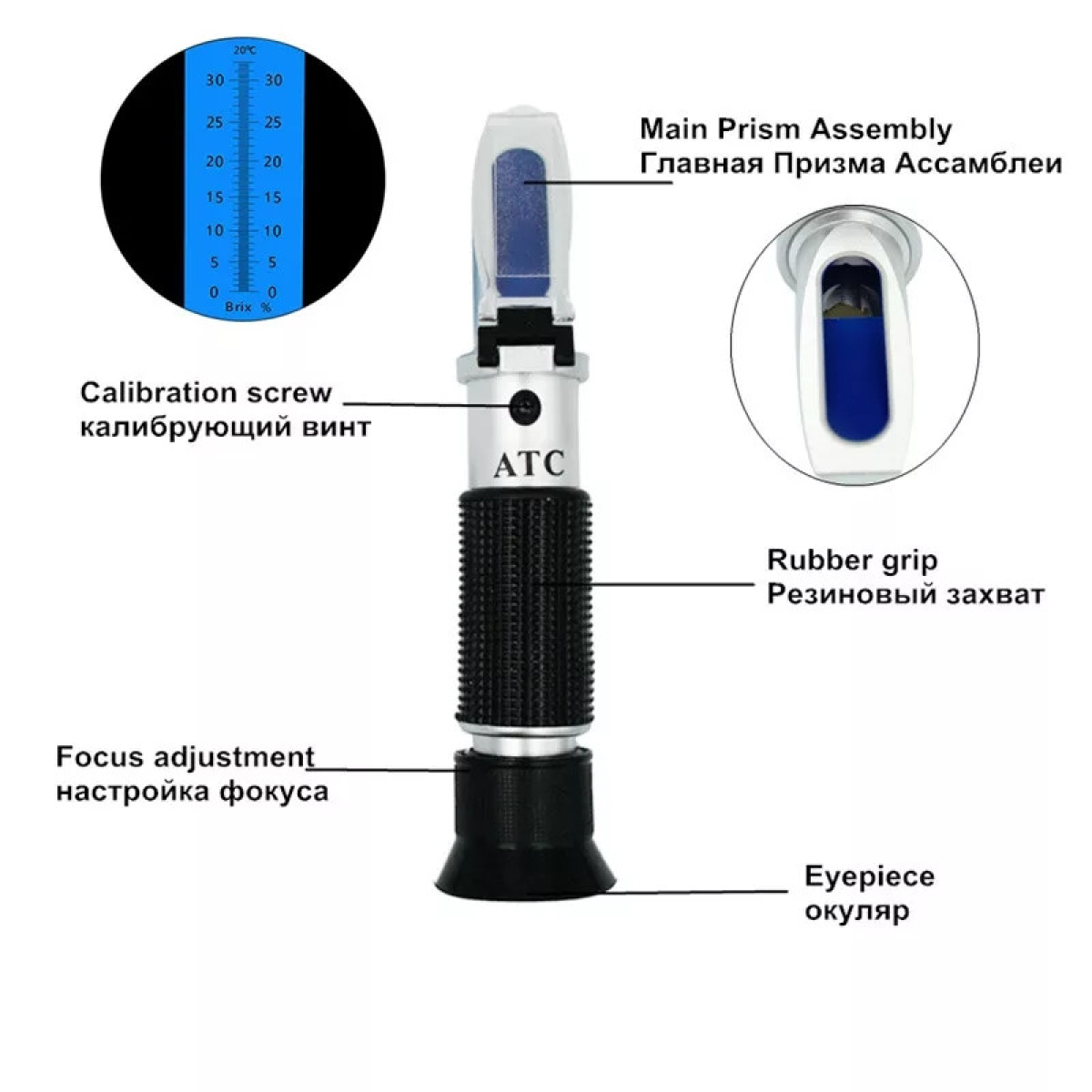 Відкрийте захисну кришку, протріть поверхню призми м“якою бавовняною фланеллю й капніть 1-2 краплі вимірюваної рідини. Закрийте захисну кришку, злегка натиснувши на неї, потім подивіться в окулярі відповідну вимірюванню Brix шкалу світлих і темних меж.